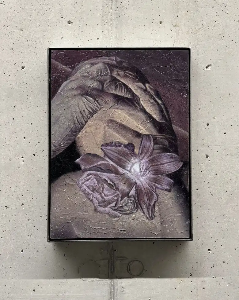 「Afterlight」と題された本展では、無機体と有機体という相反する存在への静かな眼差しが軸となり、そこから立ち上がる曖昧で変容する世界が描かれる。メインビジュアルでもある4.5m超の大型ペインティング《Micro Series T2501》では、作家自身が金属体に干渉・破壊を加えた表面を撮影し、その痕跡を絵画へと変換。光に照らされた残滓が、画面の中で拡張する宇宙のように広がる。