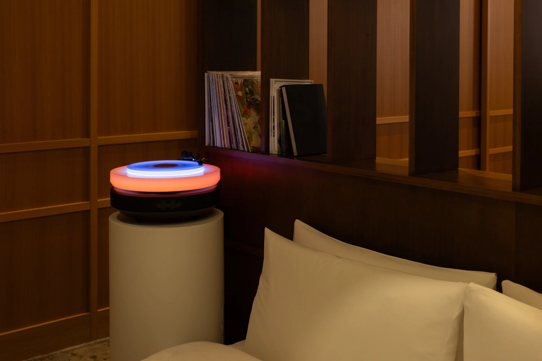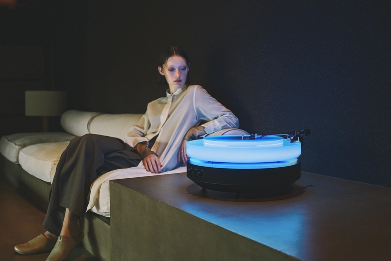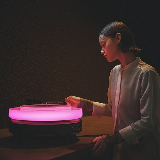 再生されるレコードと、20種類のカラーパレットから生まれる光が反応し、調和する。それぞれの光を単色で楽しめる「ベーシックモード」、滑らかに光が移ろう「グラデーションモード」、音の波を光として捉える「リンクモード」の3種類の点灯モードを搭載。ダイナミックな高揚感から柔らかなムードまで、この一台で自在に空間を彩り、視覚と聴覚で音楽に没入する体験を提供する。