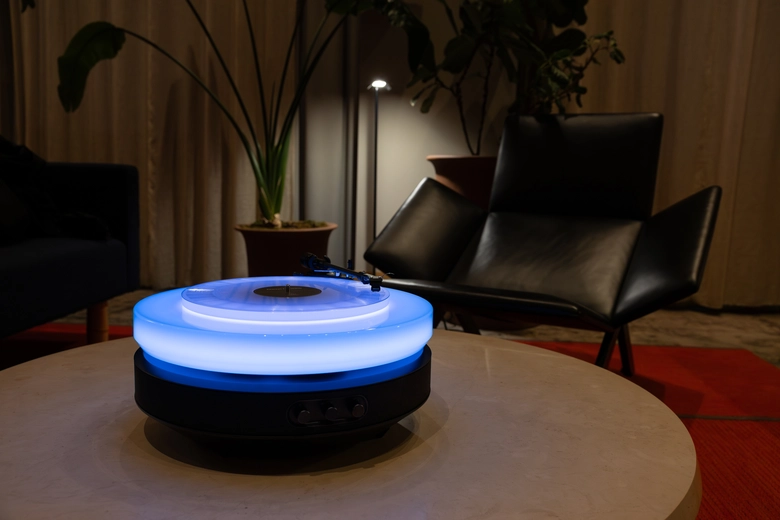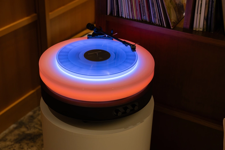 多彩なLEDとスピーカーが一体となった、世界でも類を見ないオールインワンモデルのターンテーブルで、磁気反発による浮遊構造を採用することで、スピーカーや外部からの振動が再生音に与える影響を抑え、繊細な音のニュアンスまで忠実に再現する。
