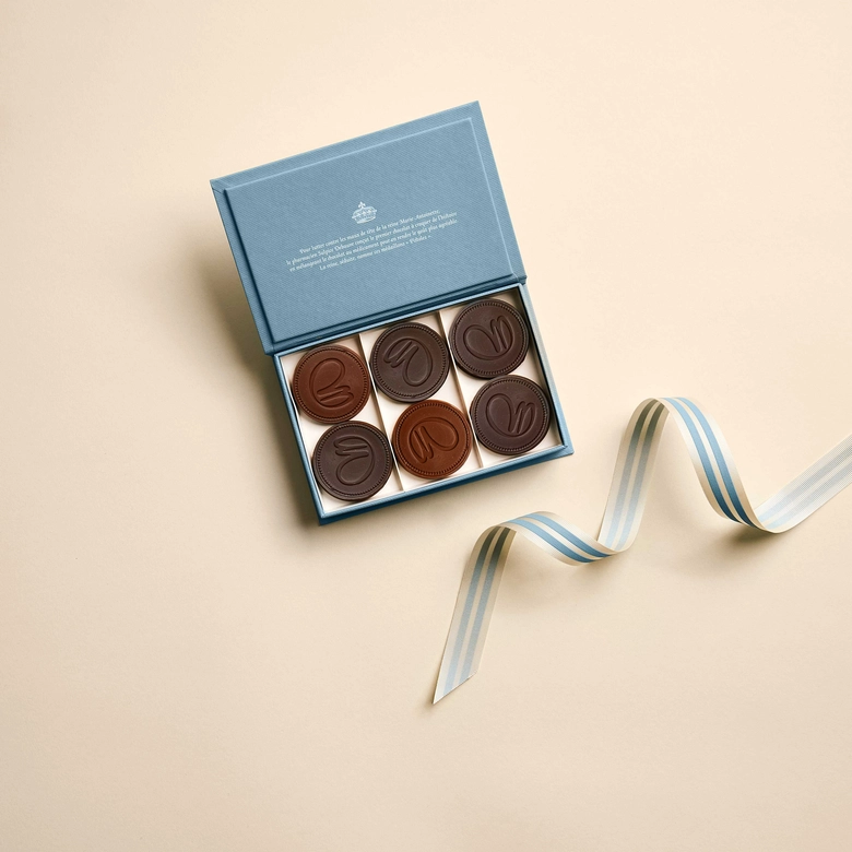 青山店では、<Debauve & Gallais(ドゥボーヴ・エ・ガレ)>を代表する円盤型チョコレート「Pistoles(ピストル)」を、シャルロット版にアップデートした青山店限定チョコレートを用意。ブランドを象徴する「Round Trip(ラウンドトリップ)」のフォルムをチョコレートに刻印し、シャルロットが74%マダガスカル産ダークチョコレートのレシピを採用している。