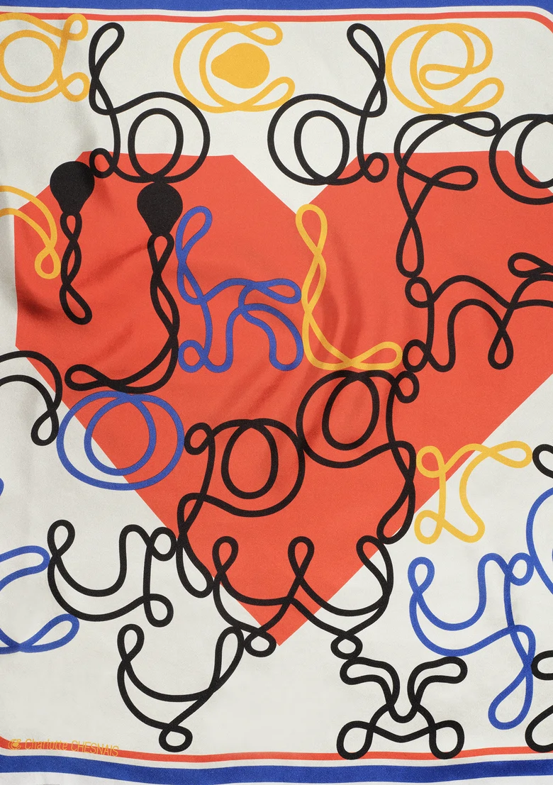 長年にわたりシャルロットとコラボレーションを重ねてきた2人組アーティスティック・ディレクター<M/M(Paris)(エムエム パリス)>が、Charlotte CHESNAIS 青山店のためだけに特別なコレクタブルシルクスカーフをデザイン。ハートモチーフと流線的なラインが描かれたアイコニックな一枚となっている。