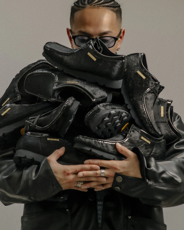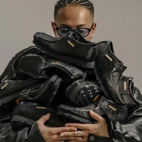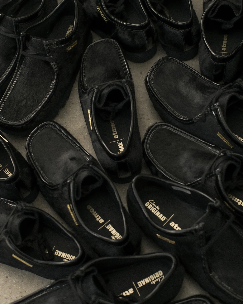 <Clarks Originals(クラークス オリジナルズ)>のアイコンモデル『Wallabee(ワラビー)』をベースに、<atmos(アトモス)>と<BlackEyePatch(ブラックアイパッチ)>の感性が融合したトリプルコラボレーションモデルが登場する。