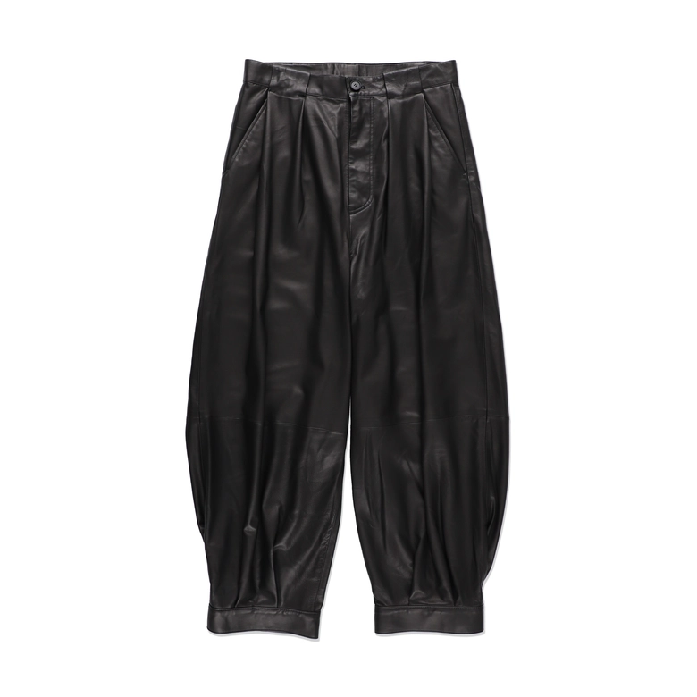 皮革とは思えないほどの肌理細かさとドレープ性を持つ、ニュージーランド原皮のベビーカーフを使用したジャケット、パンツ