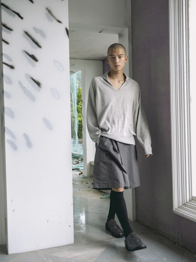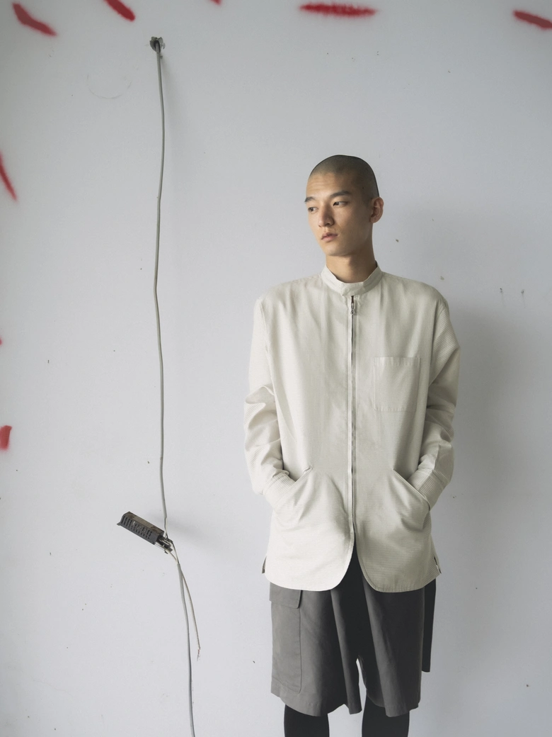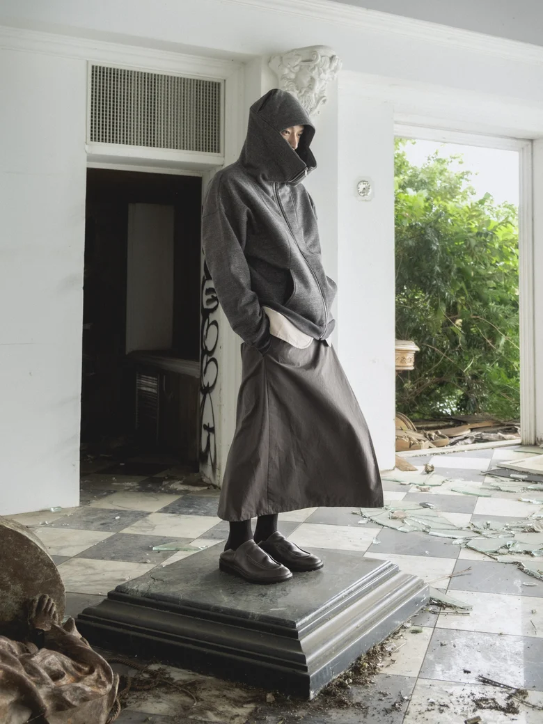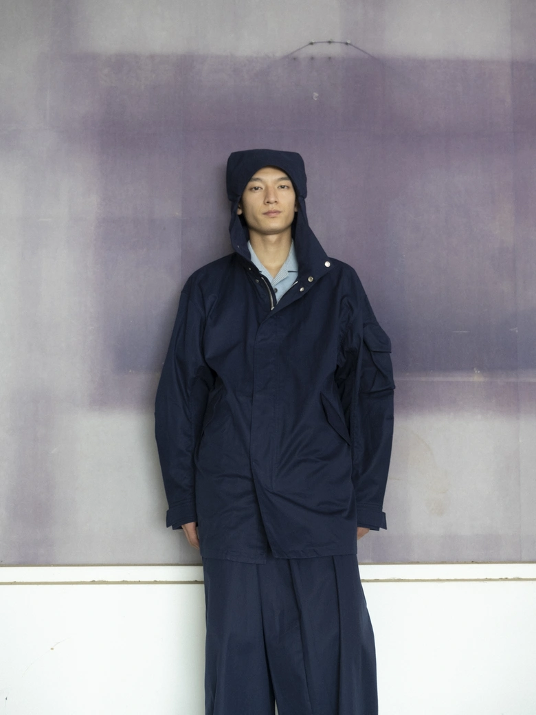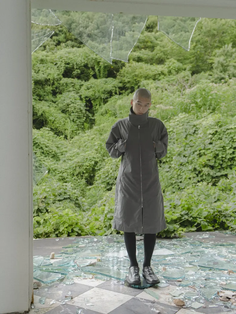 本コレクションは、情報が溢れる現代社会への問いかけをテーマとしており、James Blakeの楽曲『Like the End』から着想を得た、「不要な関心の増幅がもたらす社会全体の無関心」への違和感が核となった。映画『関心領域』の視覚表現にも通じる、見えないものの気配や構造的な緊張感を衣服に落とし込んでいる。真偽の曖昧な情報が無秩序に拡散され、正しさよりも速度が優先される時代において、タイトルの「x」は、揺らぐ真実の輪郭を表すものとして位置付けられている。