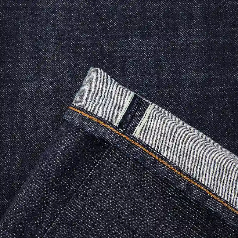 紡績を行ったのは日本製にこだわったデニム生地を世界に発信し続けている日本綿布社。100%和綿を緯糸に、ピュアインディゴをロープ染色した糸を経糸に使用し織り上げ、6番手という太い緯糸にしているため肉厚でザラ感のある独特の風合いに仕上がっている。こだわりはセルビッジ(生地の端にある耳)。一般的には赤が多いセルビッジだが、今回は日本のカラーでもあるジャパンブルーをイメー ジ、しかも生地のロープ 染 色とは違いセルビッジ部分には綛(かせ)染めしたインディゴ糸を使用している。ロープ染色とは違い芯までしっかり染まっているので、経年変化はしながらも青い色は保ち続ける。