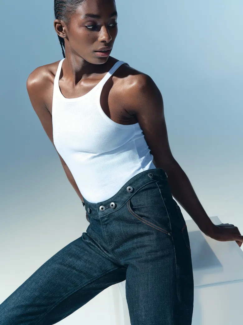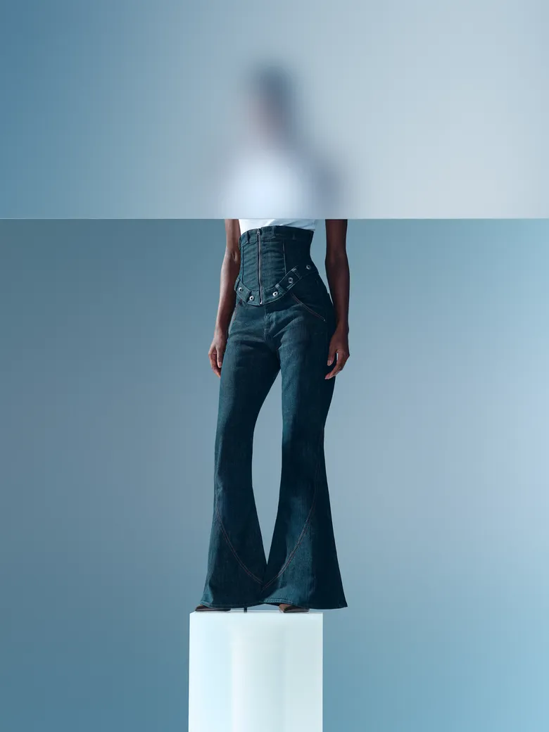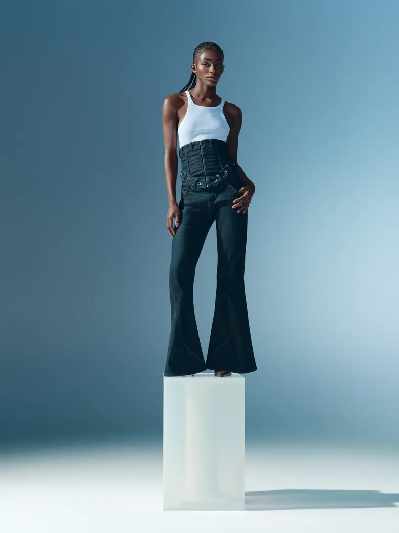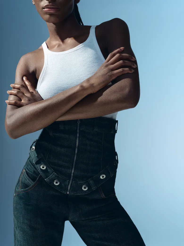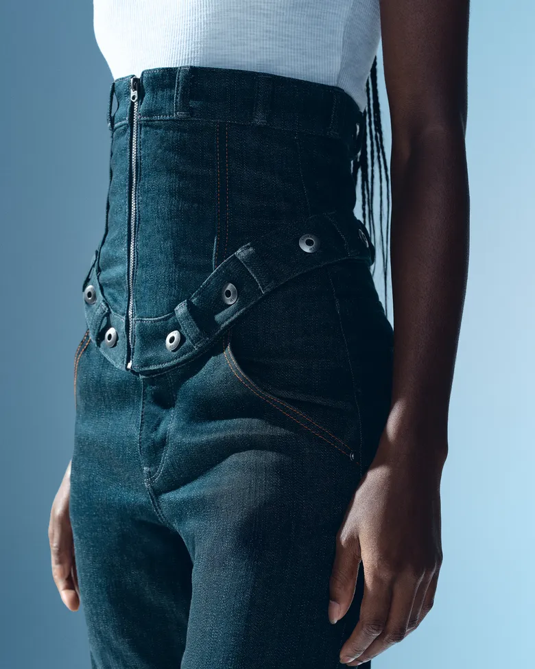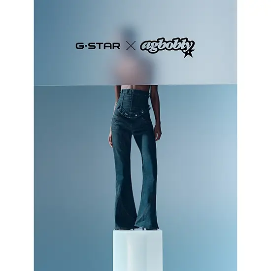 今回の「THE DENIM」では、G-STARの技術的背景と<Agbobly>の美学が融合した、エクストリーム・フレアシルエットのデニムパンツを展開。デザインの着想源は「鎧」。ウエストバンドは大きくカーブし、重厚感のあるリベットボタン付きの着脱式コルセットがセットされ、エレガントで威厳ある佇まいを実現している。素材には<G-STAR RAW>の代名詞ともいえるRAW DENIM(生デニム)を採用し、藍色の美しさを最大限に引き出すフェード加工が施されている。