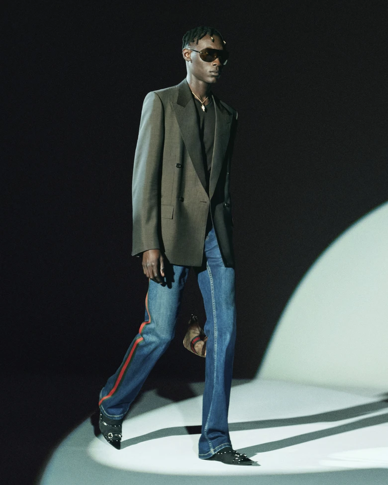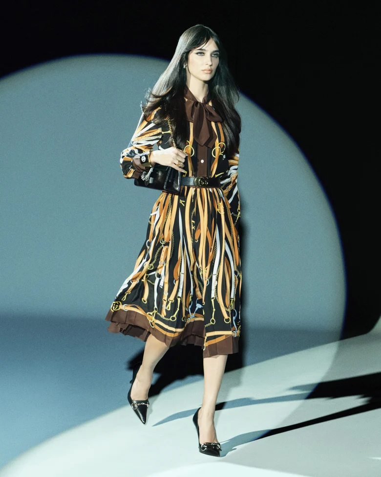 また、1970年代や1990年代の<GUCCI>を象徴するスタイルを再解釈したルックも展開されている。ウェブストライプをあしらったレーサージャケットや、ダブルGハードウェアを薄くアレンジしたバックル付きのベルト、全身をレザーやスエードでまとめたスタイリングに加え、アーカイブのスカーフを想起させるエクエストリアンプリントのセットアップなどがラインナップに加わる。