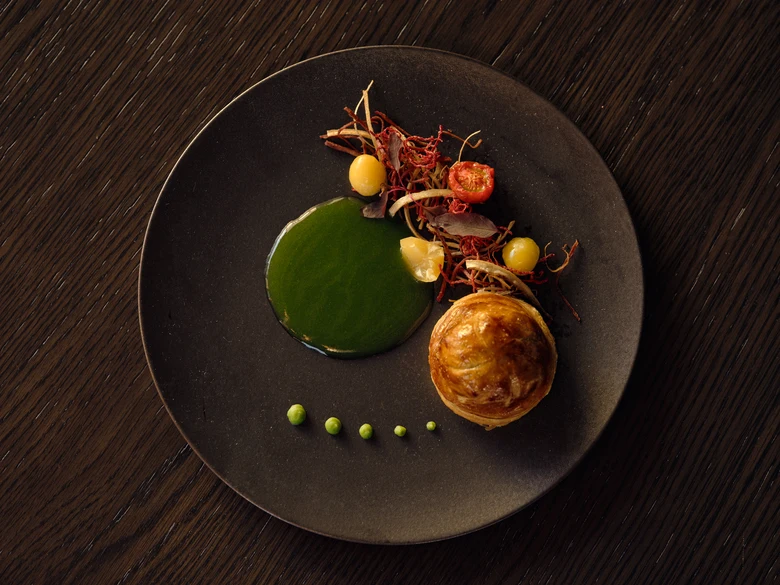 ・魚料理:本日の魚 トマト ほうれん草 パイ 牛蒡 ビーツ 紫芋 銀杏 栗 木の芽味噌 出汁