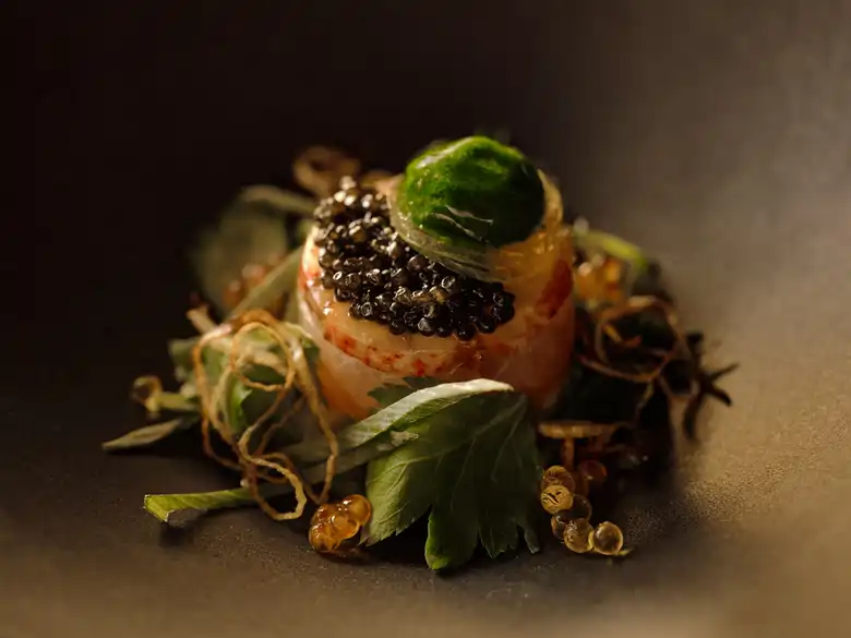 ・前菜:オマール海老 平目 サーモン アボカド クレソン 3種のキャビア 九条葱 三つ葉