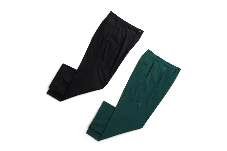 軽量コットンツイルとバイストレッチナイロンの2素材で展開されるワイドレッグのトラウザー。右脚のカーゴポケットにボックスプリーツとトライアングル刺繍を施し、補強されたサイドシームポケットが耐久性を高めている。フロントには同色の刺繍入りプリーツ、バックにはブランドロゴ入りポケットを配置。