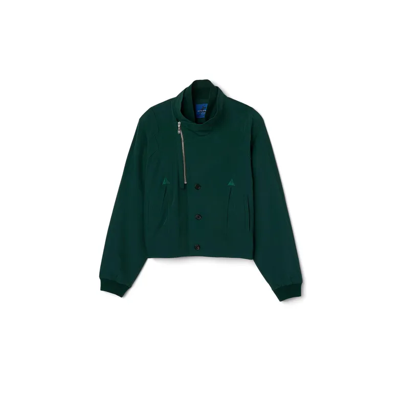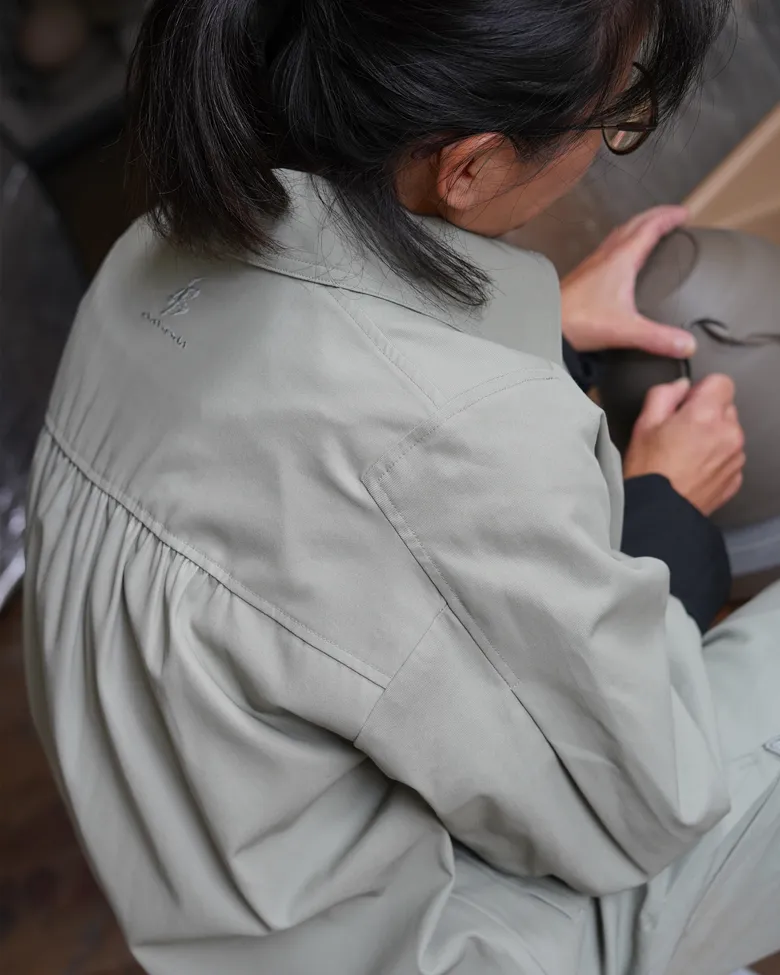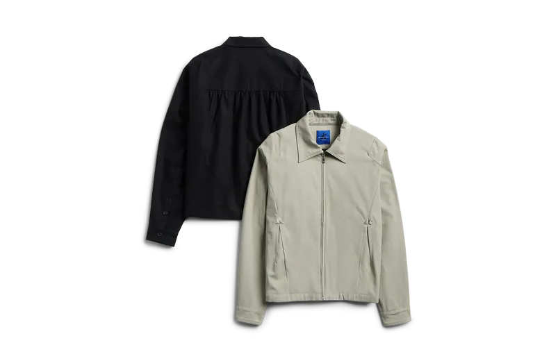軽量コットンツイル製のレギュラーフィットジャケット。4本プリーツショルダー、2ボタンのカフス、カスタムプラー付きジップフロントを備える。背面ヨークのギャザーがさりげないボリューム感を演出し、刺繍入りボックスプリーツに沿ったサイドポケットが配されている。