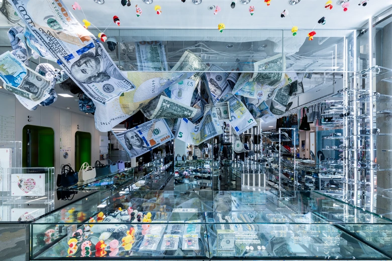 会期中は、<KOTA OKUDA>ならではの“貨幣”を⽤いた⼤胆な空間演出によるインスタレーションを実施。ホリデーシーズンを彩る華やかな装飾とユーモアあふれる作品群が、来場者を出迎える。