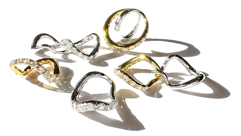 ⽇常に寄り添いながら彫刻的な造形を追求するファインジュエリー。「⾝につけた時」と「置いた時」の両⽅で存在感を放つのが特徴で、⼈体と物体のあいだに⽣まれる余⽩や⽴体感を活かし、ジュエリーでありながら彫刻のようなフォルムを追求。⽇常の装いを彩るだけでなく、まるで⼩さなアートピースをまとうような体験を提案している。