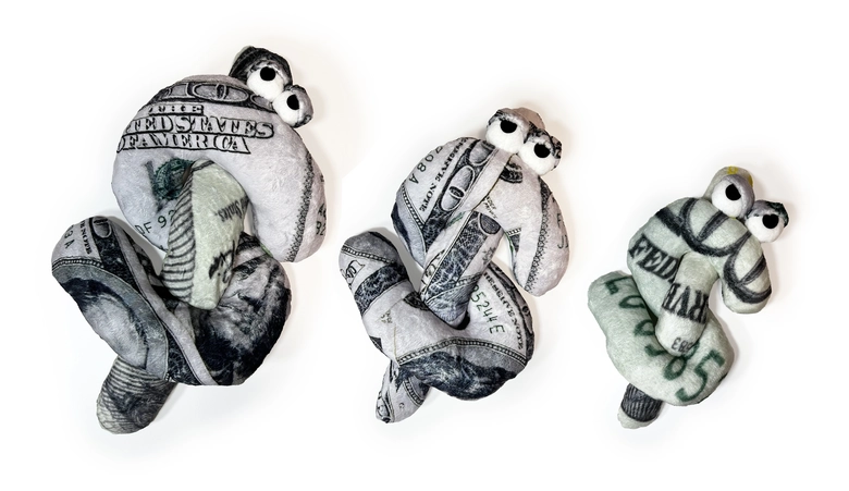 代表するアートプロジェクトMONEY WORKSでは、「お⾦」「価値」「資本主義」といった社会的テーマをジュエリーやコスチューム、インスタレーションなど多岐に渡り表現。コインや紙幣、通貨記号を⼤胆にモチーフ化し、ユーモラスなジュエリーも制作。