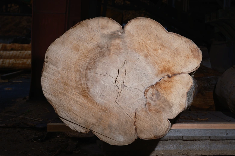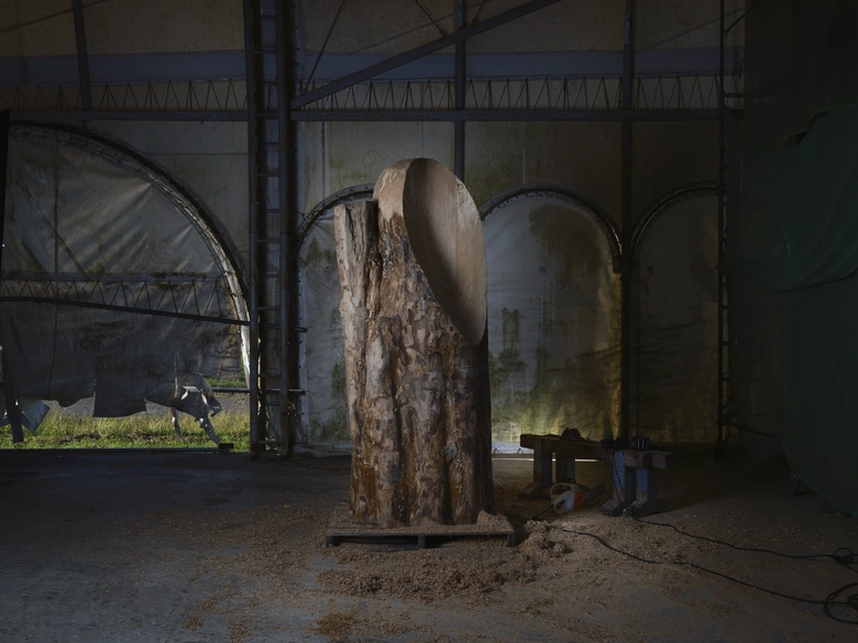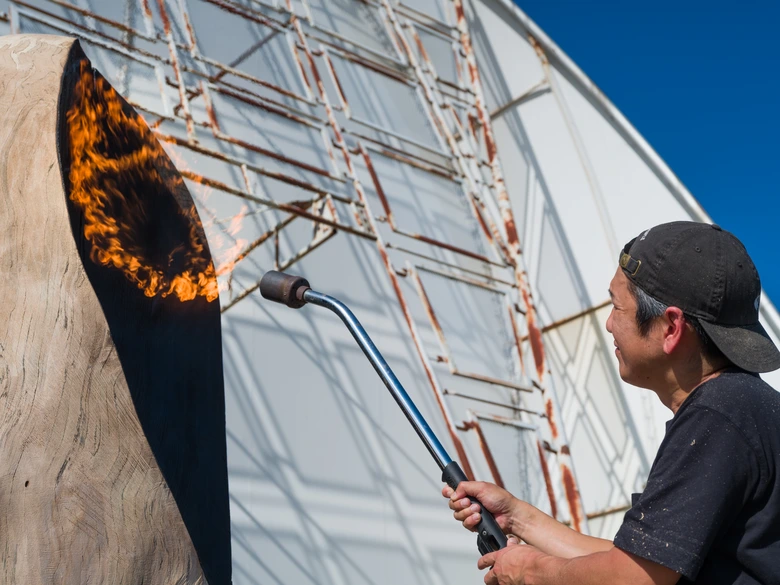 下北のヒバを使った新作「7 sculpture sketches」制作風景 2025年8月15日 北海道・飛生のアトリエ 撮影:国松希根太