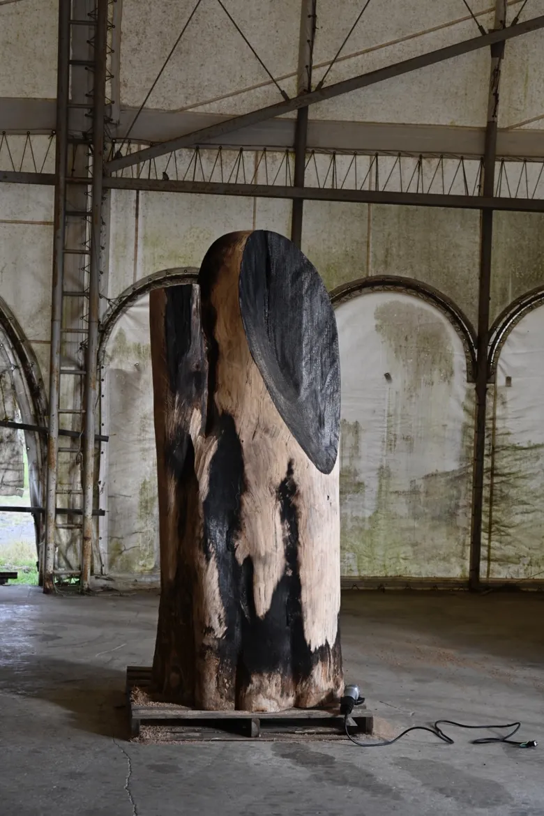 展示は、まず国松の代表作である「WORMHOLE」シリーズが林立する大空間から始まる。続く廊下では、十和田での体験をもとに制作されたヒバの彫刻が風景の記憶をまとって佇む。その先には、奥入瀬のブナを用いて十和田で制作された新作「WORMHOLE」が、来場者を迎え入れるように展示される。
