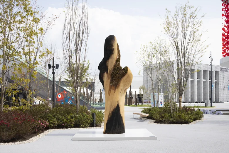 [参考写真]「WORMHOLE」2025年 約390×120×100cm 木(ミズナラ) 2025年 日本国際博覧会 展示風景