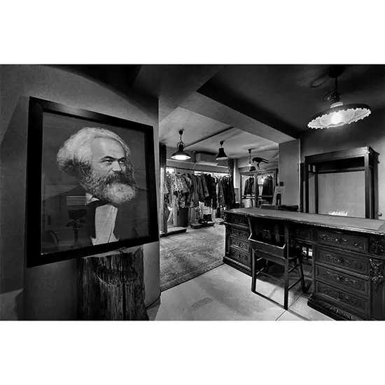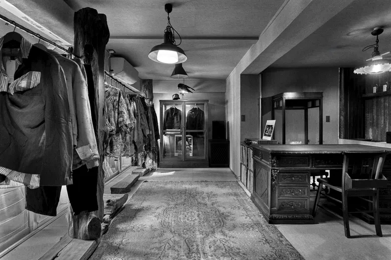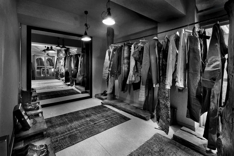 この空間は、「デジタルコミュニケーションが多様化し、ファッションがイメージや商品としてのみ消費されがちな現代への小さな反抗」をコンセプトにデザインされた。職人と共作した神代杉のラック、鍛冶屋による手打ちの鉄ハンガー、鉄筋の物干し竿、西洋・東洋のデザイナーが蒐集したアンティーク品や古道具が内装を構成し、空間そのものが思想と美意識を体現する。
