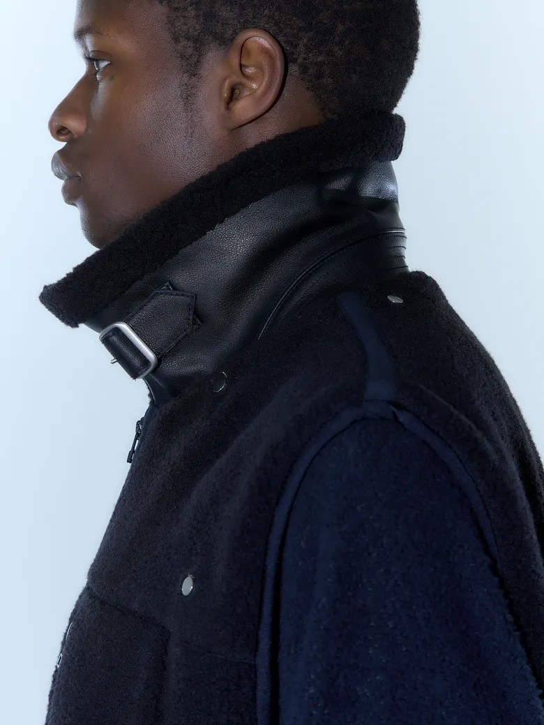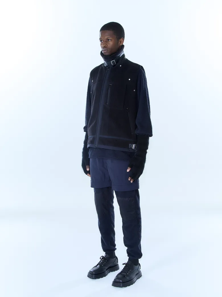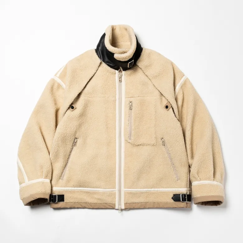レトロフリースを用いたB-3ジャケット。ラグラン形状のデタッチャブル式スリーブにより、ジャケットとしてはオーバーサイズ、スリーブを外すと肩の落ちないすっきりとしたベストとしても着用可能。さらに、胸元のベルトを留めることで、スリーブのみでの着用も可能というユニークな3WAY構造を採用している。