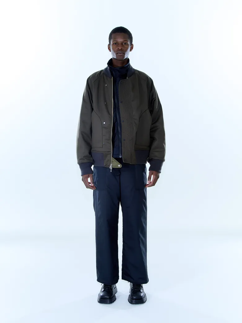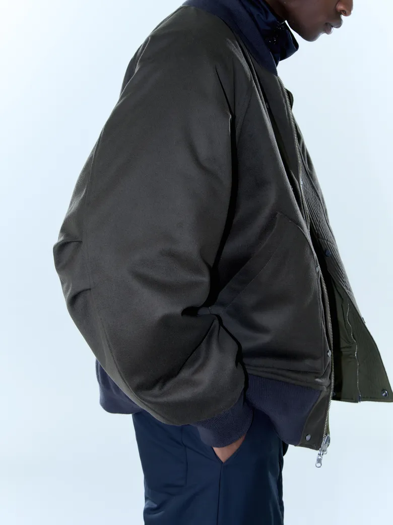 イタリア<LIMONTA(リモンタ)>社の高収縮ポリエステルツイルと、<LISARTE(リザリティー)>社のカシミアビーバーを組み合わせたリバーシブル仕様のMA1ジャケット。meanswhile定番のループジップをエクセラ製に変更し、ディテールもオキシジェンタブや二段リブなどクラシックを踏襲しながら、インサレーションにプリマロフトゴールドを採用したハイブリッド仕様。