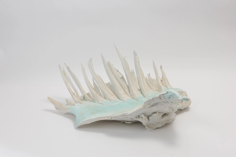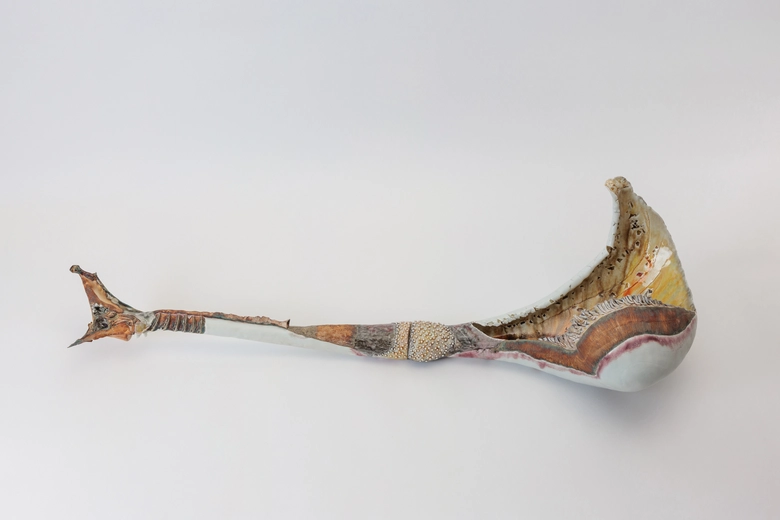 対して川端健太郎は、磁土を手びねりし編み込むことで生まれる有機的な造形に、ガラス片や金属質の釉薬を重ねた独自の世界を展開する。身体の一部を思わせるような官能的な曲線や、折れ目に潜む異素材の装飾には、陶芸の既成概念を軽やかに飛び越える探究心が宿る。