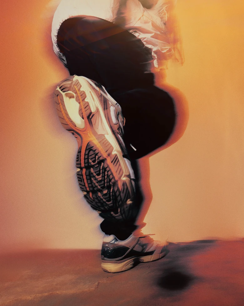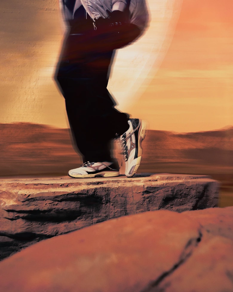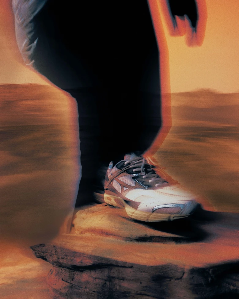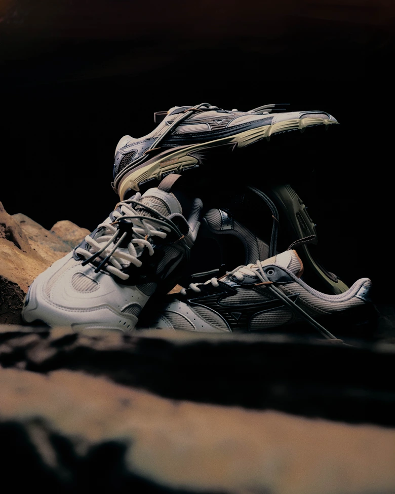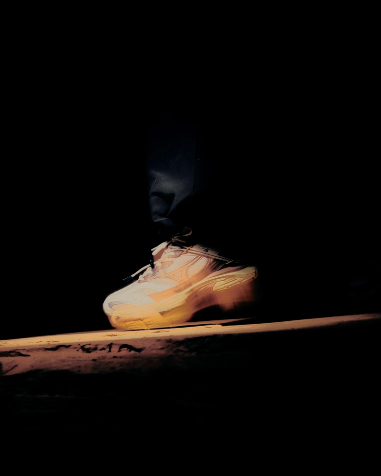 Y2K時代のアスレチックスタイルをベースに、ディテールを幾重にも重ねた<AFEW>ならではの解釈と、ミズノの伝統と革新を融合させたデザインは、無限の可能性と、広がる空に向かって飛び立つかのような挑戦を表現している。