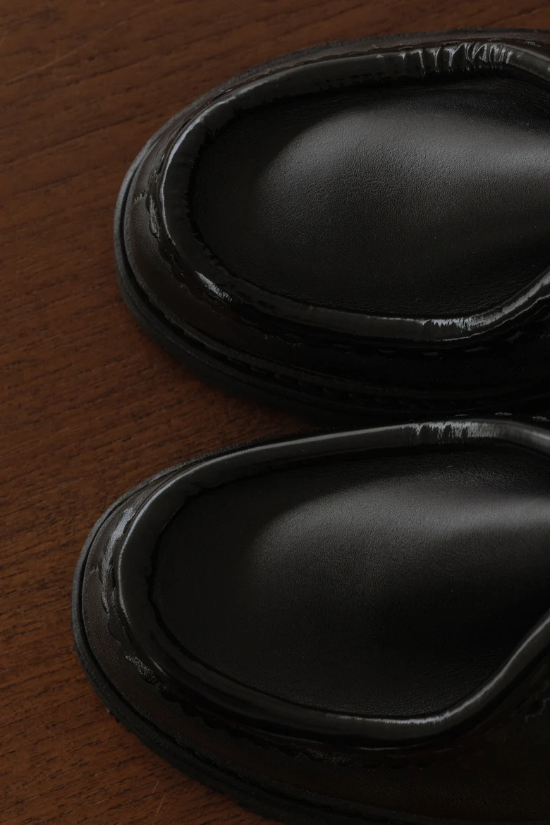ステッチは白からブラック一色に変更され、ウェルトは「スクエアウェルト」から「ストレートウェルト」に改められた。ライニングとインソールのカラーもナチュラルからオールブラックに統一されている。さらに、モカシン部分のパイピングはスムースレザーからガラスレザーに変更され、ミッドソールの厚みは3mmから5mmへとボリュームを増し、重厚感を加えている。