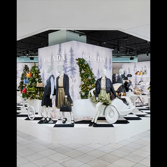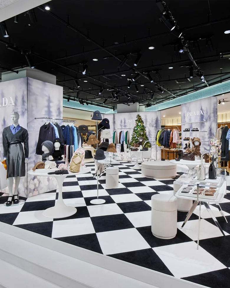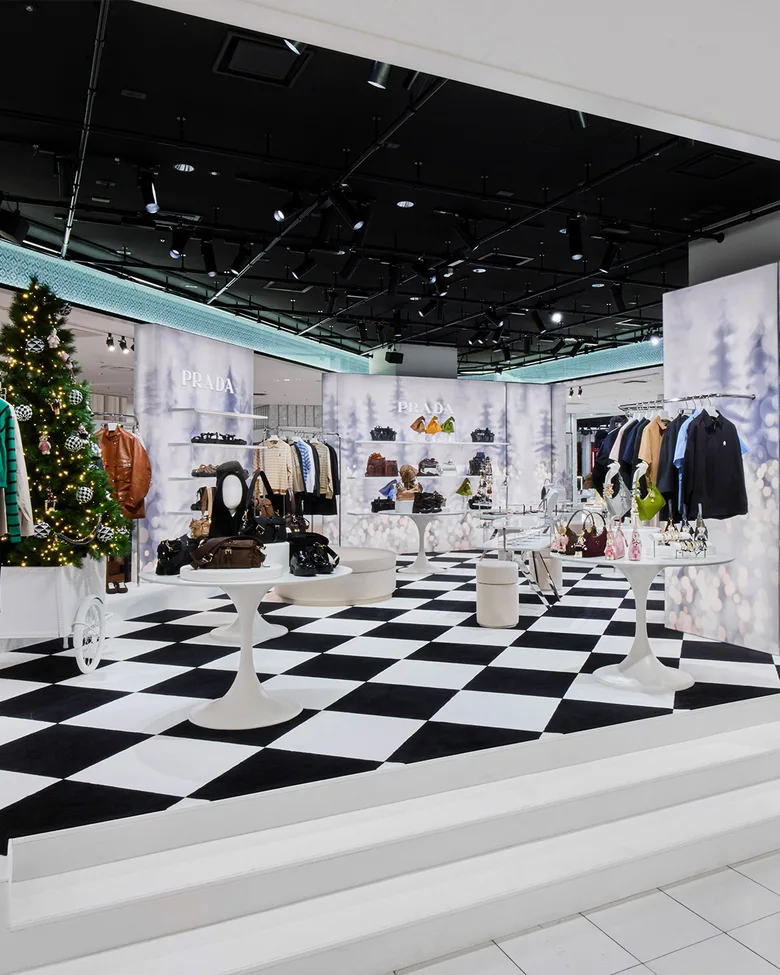 本ポップアップは、ホリデーシーズンを迎える前のひとときを切り取ったような物語性のある空間演出が特徴。クリスマスツリーを積んだカーゴバイクや白い車が、非日常的な演出を加え、バックライトで照らされた壁面には雪景色の幻想的なイメージが広がる。床一面に敷かれたブラック&ホワイトのチェッカーカーペットが空間にリズムとコントラストを与え、<PRADA>ならではの洗練された世界観を引き立てている。