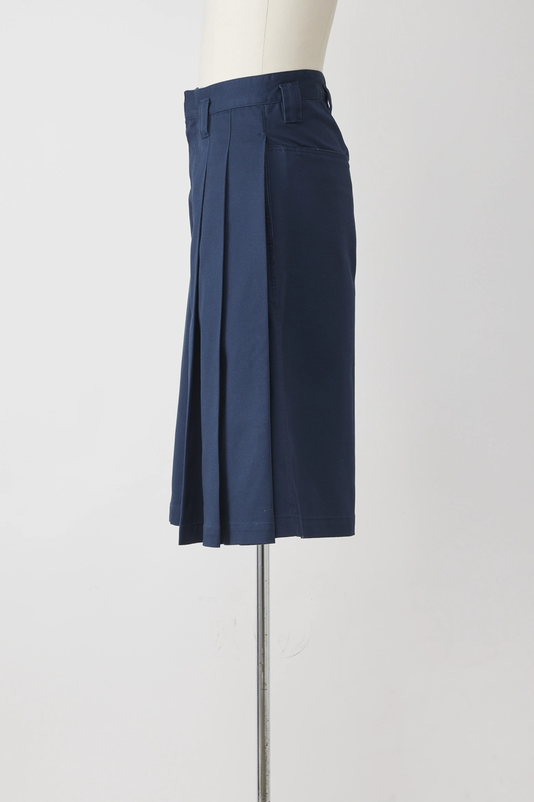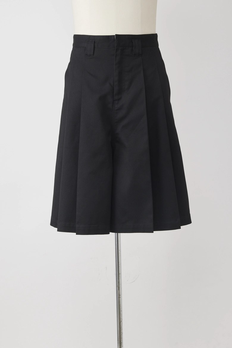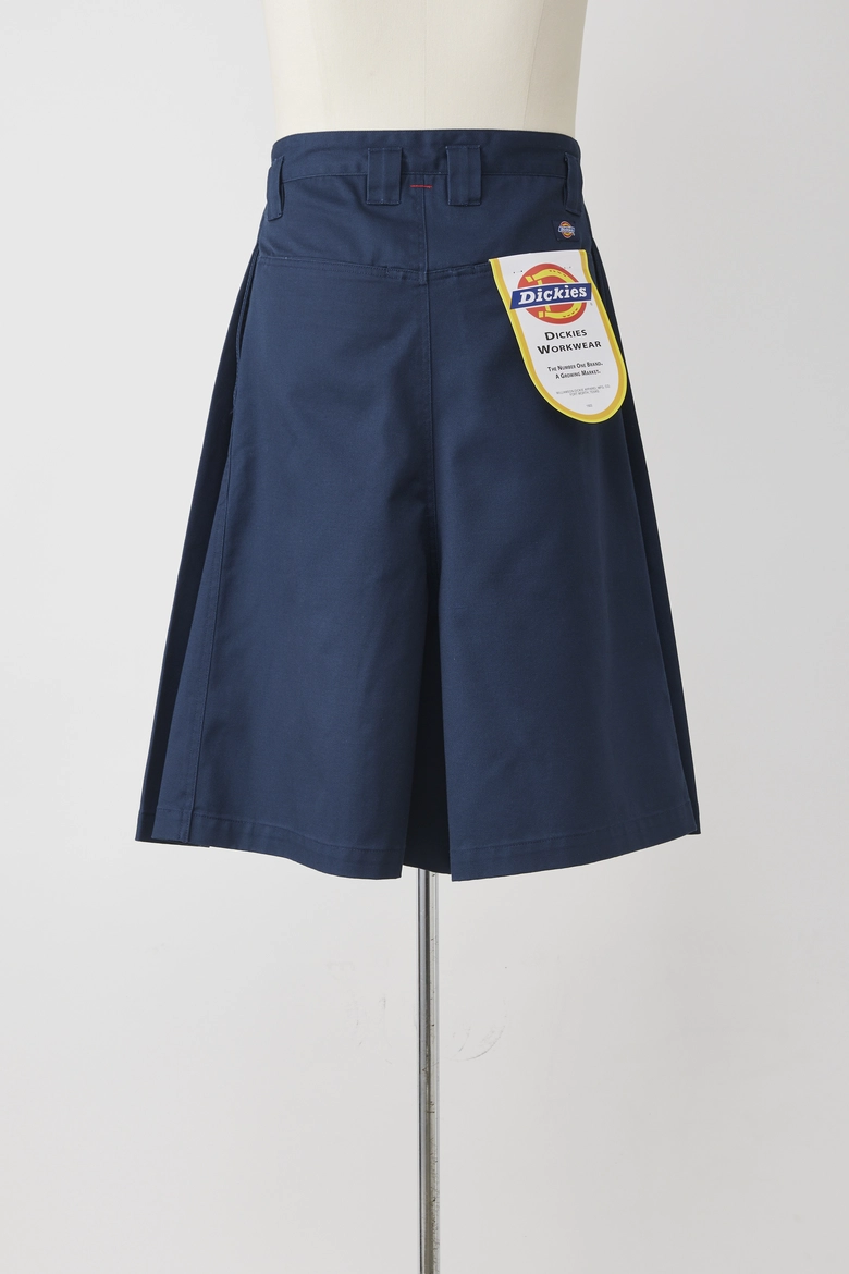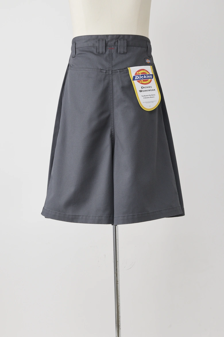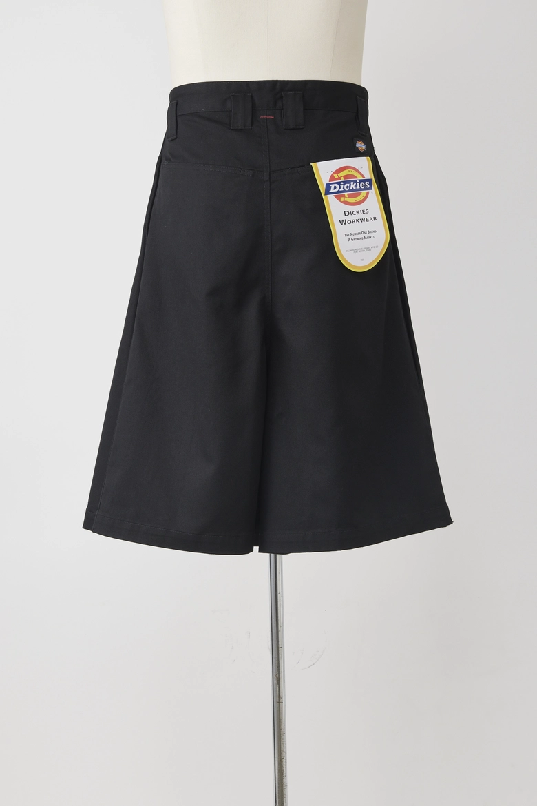 キルトスカートの構造を応用した2タッククロップドパンツ。前方からはスカート、後方からはパンツに見える“視点で表情が変わる”デザインが特徴。<Dickies>のT/Cツイル素材を採用し、セットアップとしても単品としても高い完成度を実現。