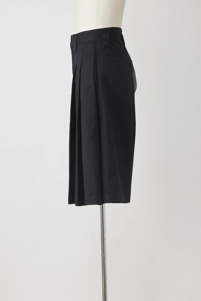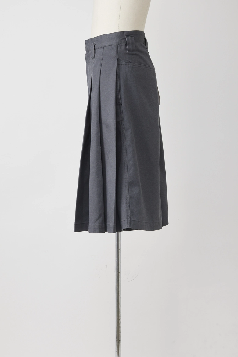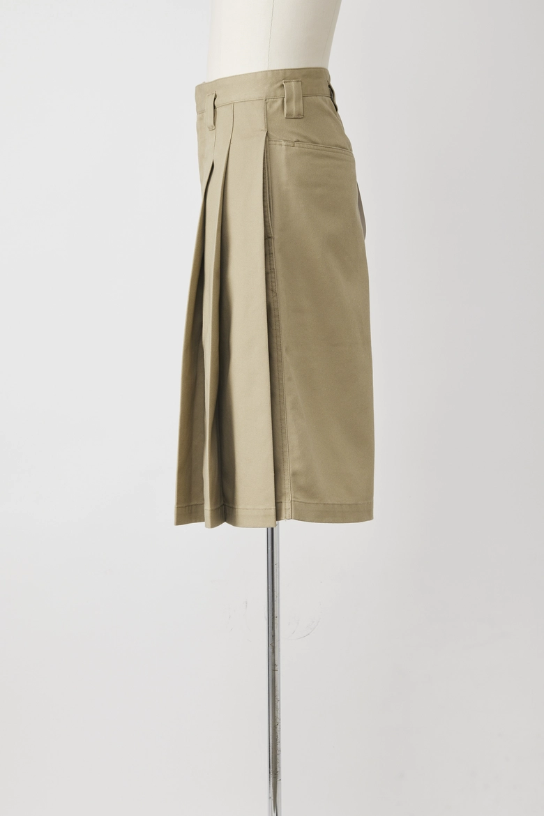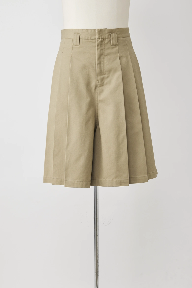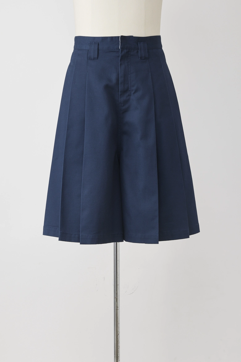 キルトスカートの構造を応用した2タッククロップドパンツ。前方からはスカート、後方からはパンツに見える“視点で表情が変わる”デザインが特徴。<Dickies>のT/Cツイル素材を採用し、セットアップとしても単品としても高い完成度を実現。