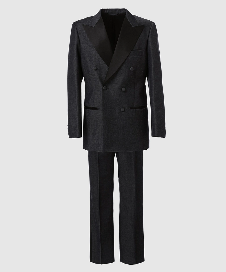 今回登場するセレモニーウェア「WOOL DENIM TUXEDO」は、本アイテムのために開発された特製ウールサージを表地に採用し、ブランドオリジナルのデニム生地を基にした染色と織りによってデニムの質感を巧みに表現している。
