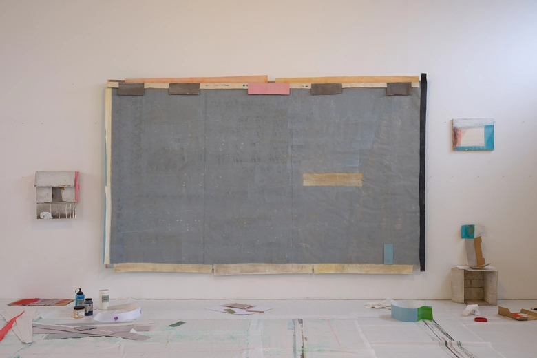 本展は、現代日本を代表する画家・杉戸洋が、絵画の「余白」に着目して構成する意欲的な個展。たとえば、カンヴァスの縁を囲むように貼られた紙や木片のような「えり」や「へり」、あるいは、本の表紙をめくると現れる「あそび紙(flyleaf)」や、服の裏地(liner)といった、見過ごされがちな存在に心を傾けることから制作は始まる。