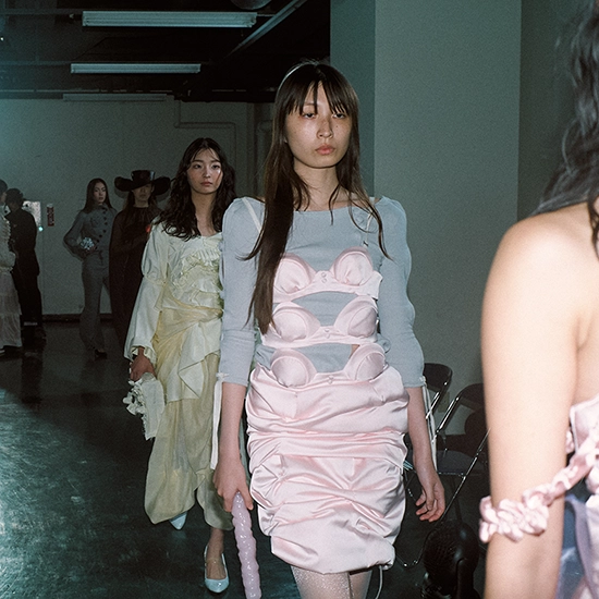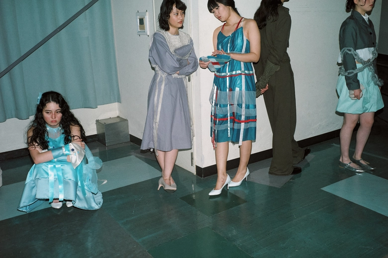 会場は科学技術館。繊維研究会が理念に掲げる「衣服を媒体としたファッション批評」の一環として、絶え間なく変化する流行と、それに付随して加速する消費スピードをテーマに空間を設計した。刹那的で安易な購買行動や資本主義の姿を具象化する狙いのもと、青白い照明、天井に張り巡らされたパイプ、3つのランウェイが重なり合って生まれる“交差点”を構成要素に設定。さらに会場中央を貫く柱を、不変的存在が変わりゆく世界を貫く「貫通」を想起させる装置として位置付けた。