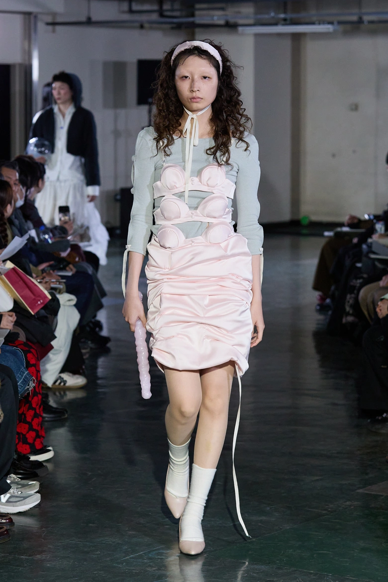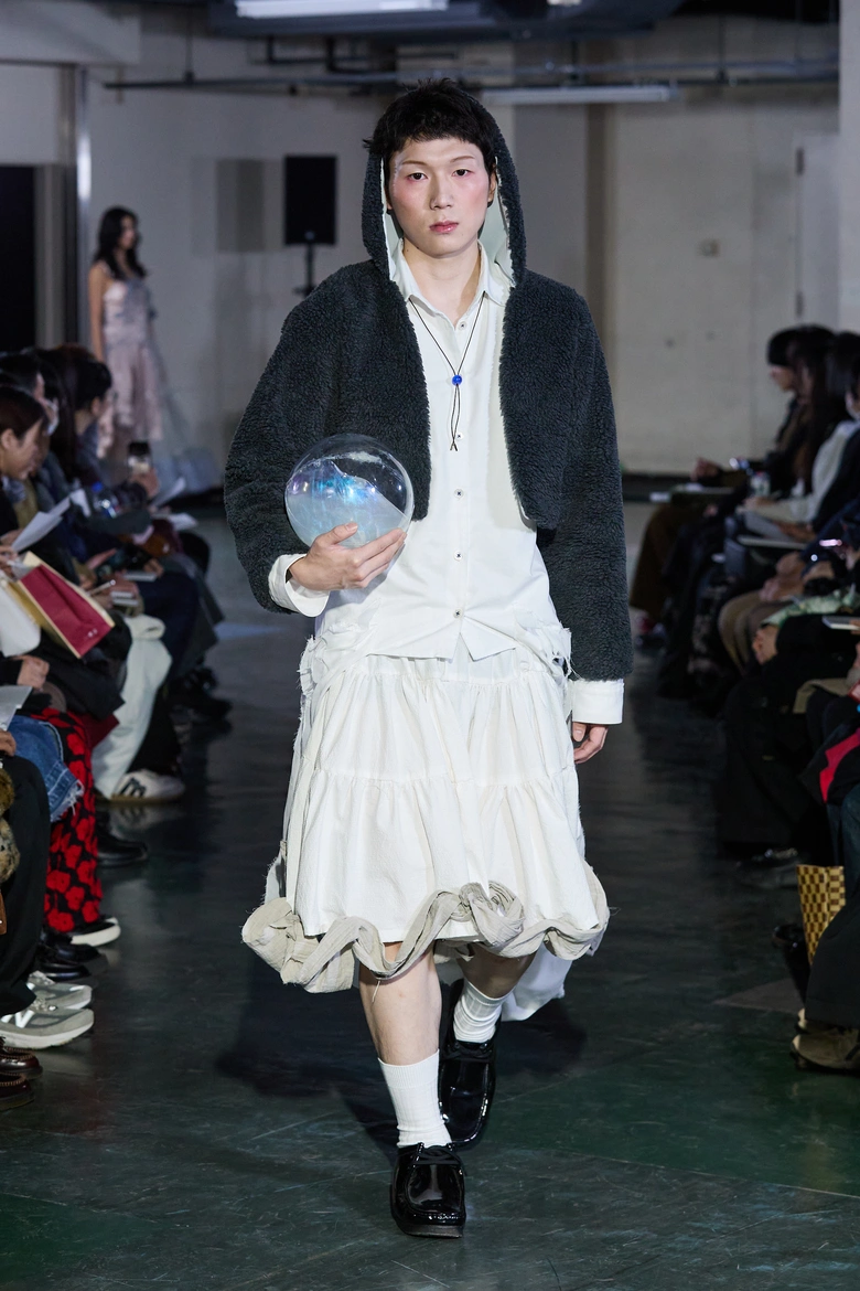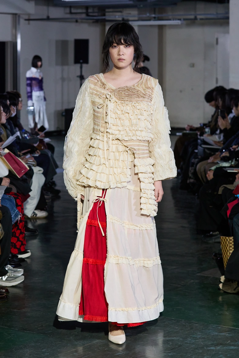 今年度の特徴として、初の試みとなるメンズルック3体を製作。「あの日の翼」(片野仁愛)、「you are preserved in me」(柳小春)、「布」(阿部櫂斗)を発表した。さらに初となる取り組みとして、全ルックにおいて携行可能なファッションアイテムを製作。手縫いで刺繍を施したハンドバッグやウサギのぬいぐるみに加え、アルミ製の薔薇の花束、内部に液体を湛えた透明のボール、黒いベールの下で鼓動を刻む心臓など、ショーピースならではのアイテムも披露された。