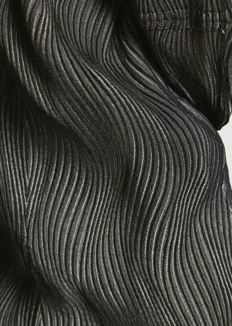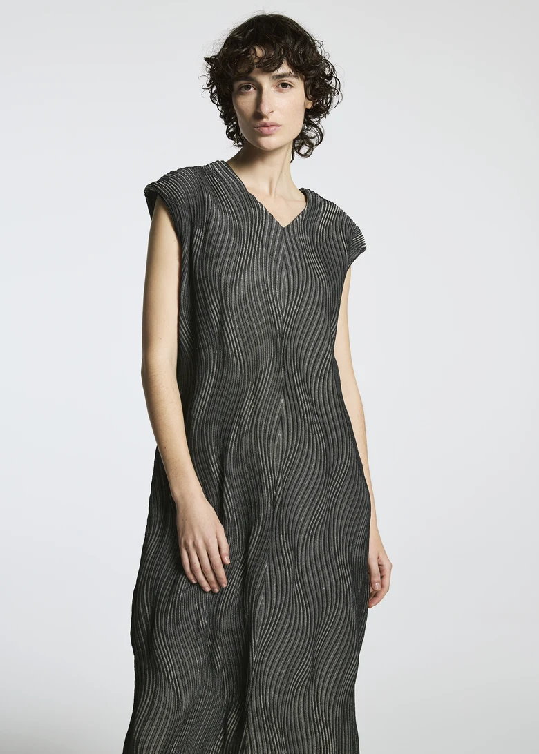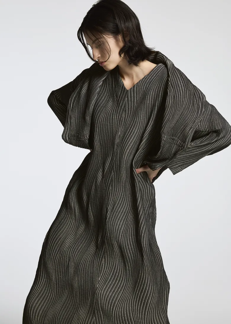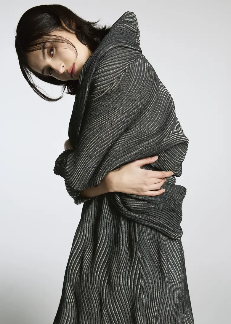 第二弾では、ボレロとドレスを展開する。ヨコ糸に染色を施さず素材本来の色を生かしたBrewed Protein™ファイバーを織り込み、ポリエステル糸との縮率差を活用し、スチームストレッチ技法によるプリーツ目を形成している。