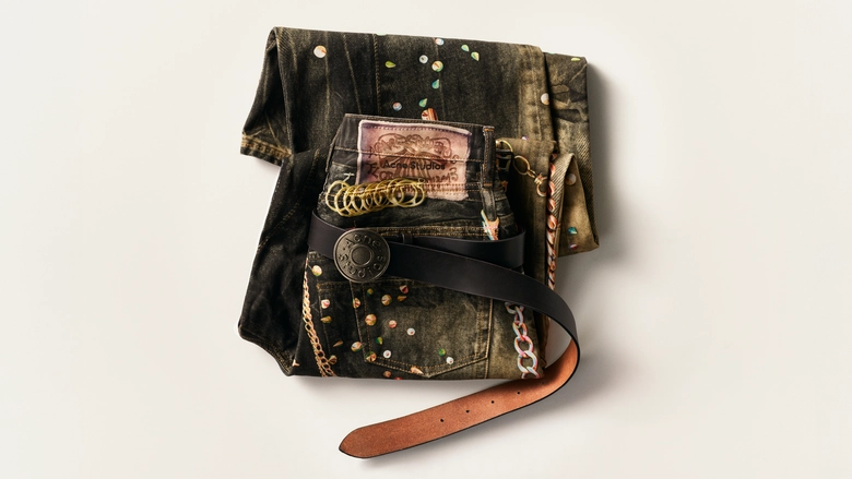 トロンプルイユデニムは、リラックス感のあるシルエットに、ゴールドのキーチェーンとハート型のキーチャームを組み合わせ、遊び心のあるアクセントを加えている。デニムと同様にトートバッグは、トロンプルイユの物語性をさらに広げる。パープルピンクのディップダイ加工とスプレーエフェクトのロゴを施したCamero Partyバッグは、レトロなフォルムと実用性を融合させ、シグネチャーのキーチャームに特別仕様のハートチャームを組み合わせている。