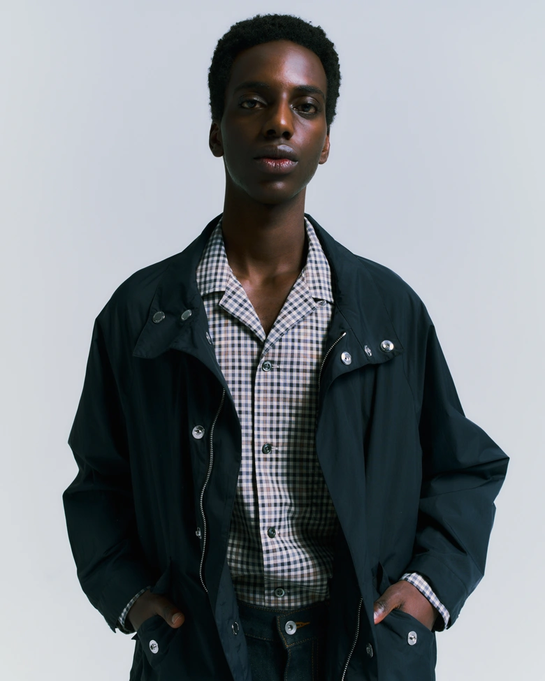 素材には、100%リサイクルナイロンとフッ素フリーの撥水剤を使用。原料から加工に至るまでサステナブルな背景を持ち、軽やかさとしなやかさを兼ね備えることで、長いシーズンにわたり着用できる汎用性を備えている。ミリタリーの要素を残しつつ、現代的で洗練された印象へと昇華した一着だ。
