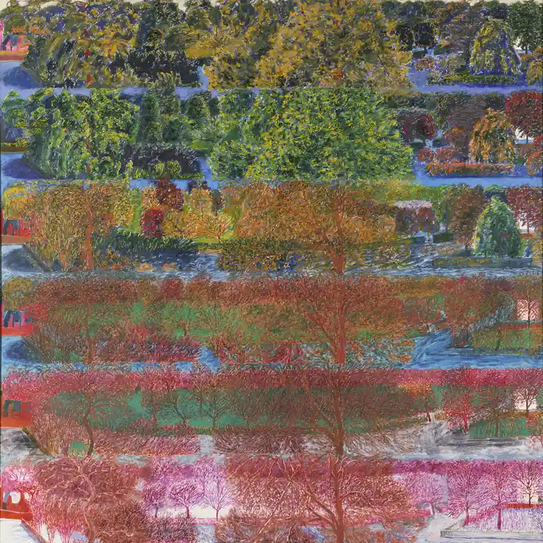 キャリアの初期から晩年にいたるまで一貫して風景画を追求し、特に1960年代から約20年間、自身のアトリエを構えたロンドンのリージェンツ・パークを繰り返し描き続けた作品群で知られている。ひとつのキャンバスに複数の空間表現や異なる時間軸を織り込むという独自の手法は、やがてイギリス各地の庭園や旅先の風景へと主題が広がっていく過程で、さらなる展開を見せていく。