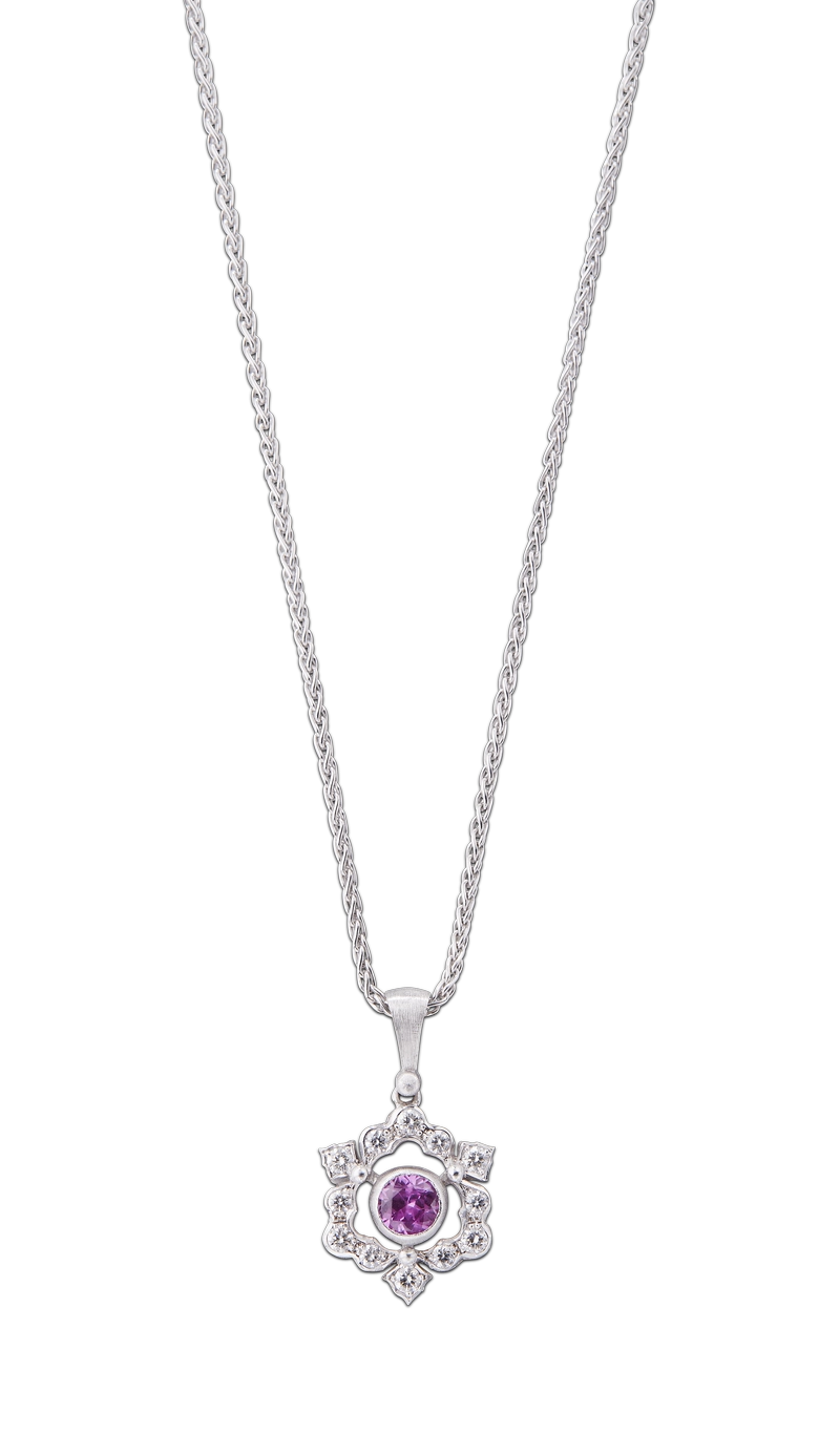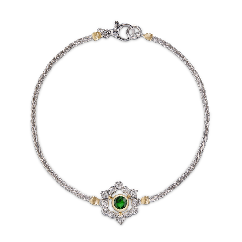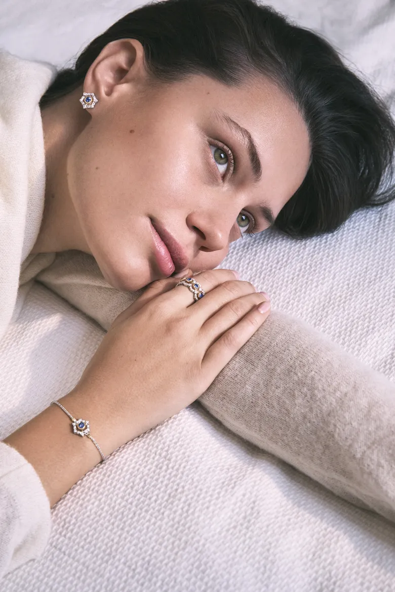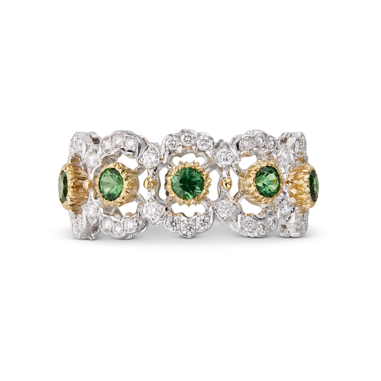 使用されているストーンは、知恵と誠実さを象徴するブルーサファイア、愛と幸運を表す繊細なピンクサファイア、そして生命力の象徴である鮮烈なグリーンのツァボライトの3種。それぞれが、<BUCCELLATI>の伝統的な意匠に華やぎを添える。
