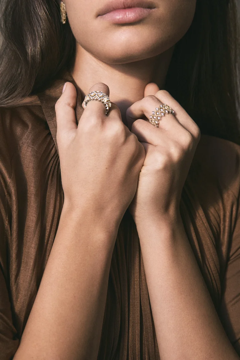 「モザイコ」コレクションより イヤリング¥1,870,000 リング(左手)¥2,915,000 リング(右手)¥5,500,000