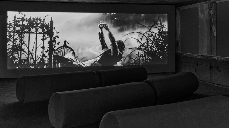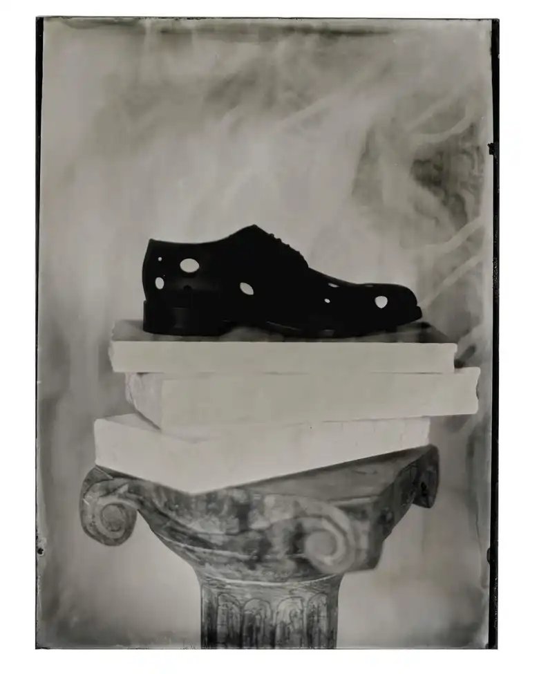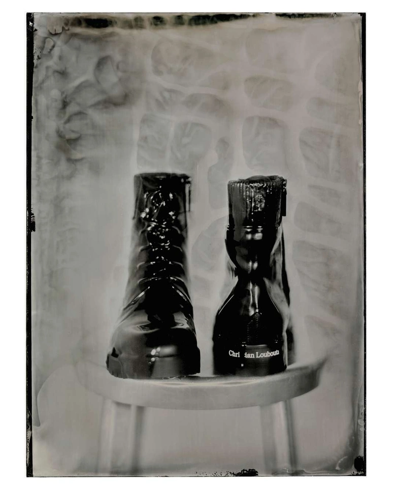 エキシビションは、プロジェクション・ルームから始まる。メゾンを象徴するレッドがプリズムとなり、静かな思索へと導く空間だ。ニエプス、ダゲール、リュミエール兄弟といった先駆者たちに着想を得て、ジェイデンは光と動きが初めて捉えられた映画の起源を振り返る。メンズ26AWコレクションのシューズは、アートワークやテクスチャーとともに複数のスクリーンに連続して映し出され、初期映像を思わせるざらついた質感で描かれた中世の城のシルエットを背景に、<Christian Louboutin>のメンズコレクションの新たな世界観を構築していく。