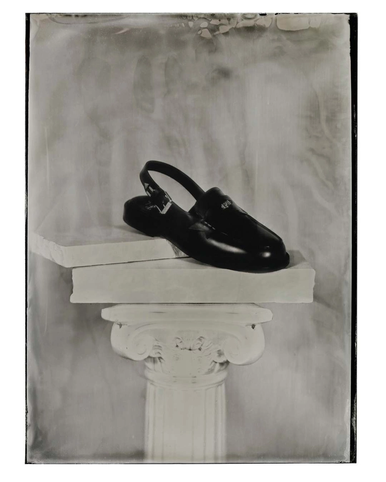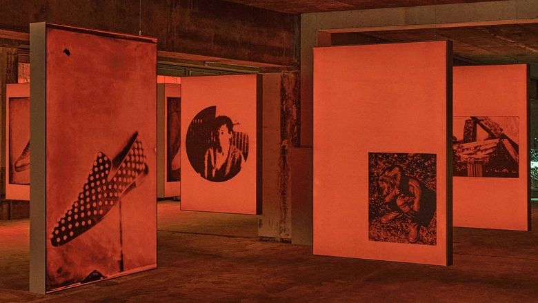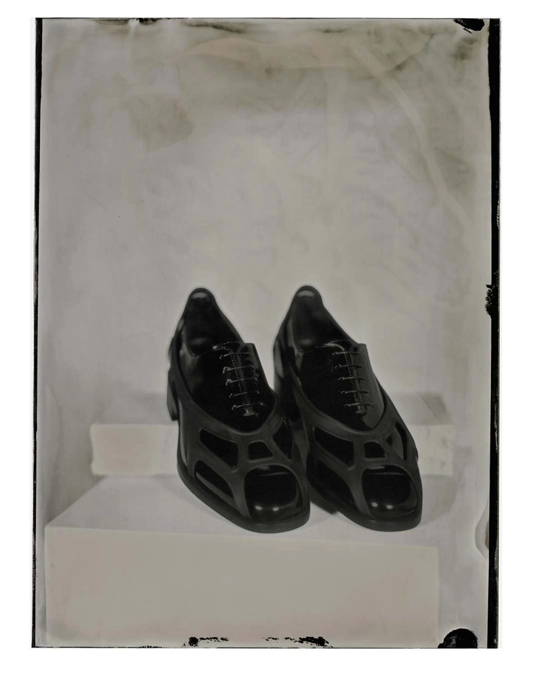 続いてフォト・インスタレーションでは、ジェイデン・スミスのピースを紹介。その一部は初期の写真技法を用いて撮影され、布の下で撮影されたのち、銀と化学溶液による手作業の現像によって、そのフォルムが浮かび上がる。選ばれた写真は、メゾンのシグネチャーを想起させる赤い光に照らされたネガとしてプリントされている。