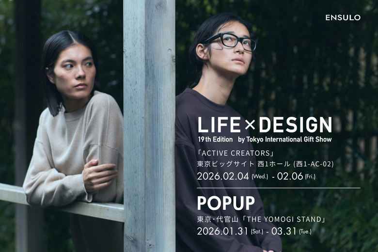 循環型ライフスタイルブランド<ENSULO(エンスーロ)>が、2026年2月4日(水)〜6日(金)に開催される「第101回 東京インターナショナル・ギフト・ショー 春2026」同時開催展「第19回 LIFE×DESIGN」内「ACTIVE CREATORS」に初出展する。加えて、代官山の「THE YOMOGI STAND」では、1月31日(土)から3月31日(火)までの2ヶ月間にわたりPOPUPイベントを実施。