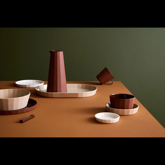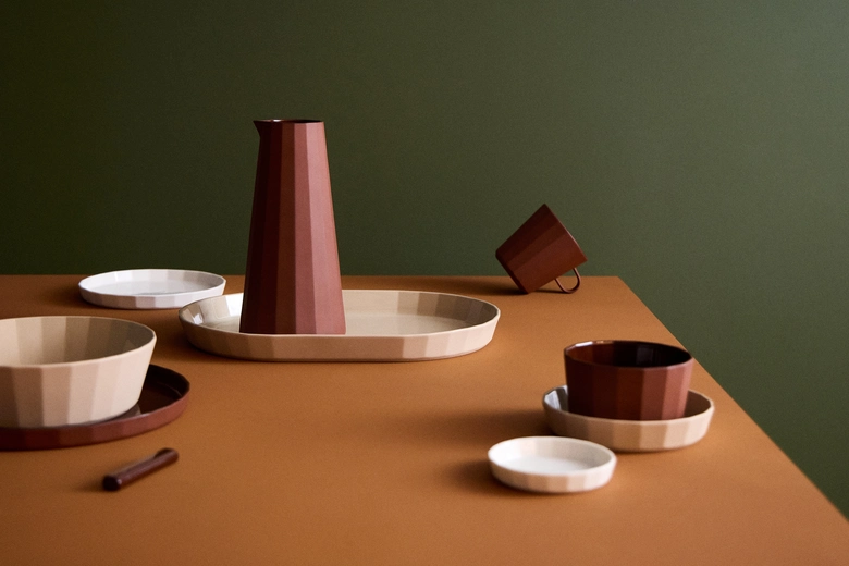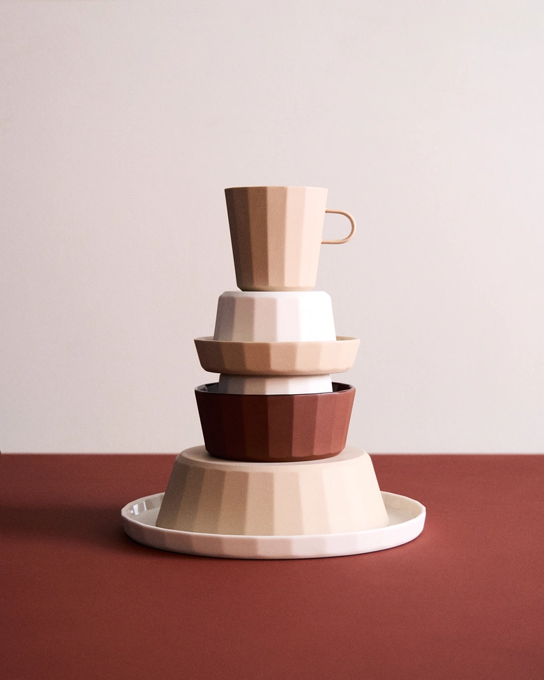 「FADE」は、韓国の伝統的な瓦屋根からインスピレーションを得て生まれたテーブルウェアのコレクション。やわらかく面取りされた無釉の外側と、なめらかな釉薬仕上げの内側とのコントラストが特徴で、光を受けることで表面に繊細で奥行きのある表情が浮かび上がる。素朴さと洗練が同居するデザインは、日常使いはもちろん、特別な食卓シーンにも調和する。