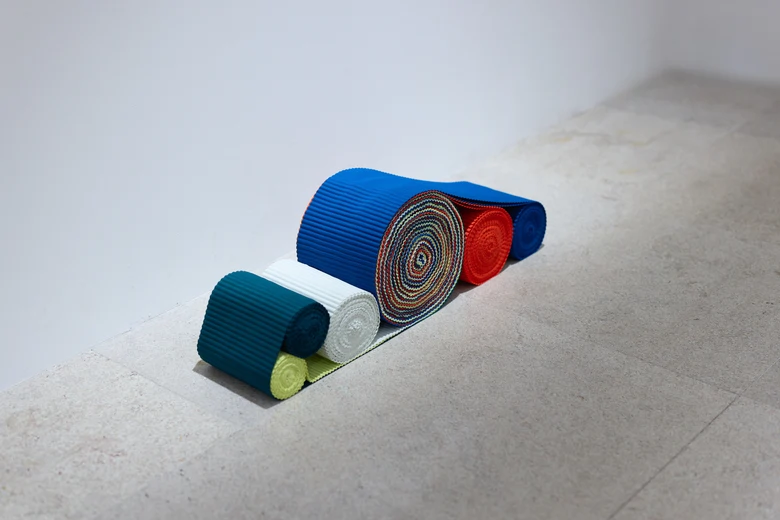 本展には、このプロセスとともに、衣服の試作の過程、そしてプリーツの可能性を紐解く作品群が並ぶ。引っ張る、巻き付ける、折りたたむなど、あらゆる行為が試され、素材のまだ見ぬ表情が現れる。彫刻的な作品はコレクションの衣服とは一見対照的な存在に思えるが、「日常着」の新しいあり方の研究という視点で有機的に連続している。