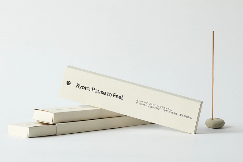 本ストアは、京都という街が持つ静けさや穏やかな時間の流れに着想を得て、日々の忙しさの中で一度立ち止まり(Pause)、呼吸や姿勢、肌ざわりといった自身の感覚へ意識を向ける(Feel)という想いを込めて、店舗限定のメッセージ 「Kyoto. Pause to Feel.」を掲げている。メッセージは、ストアの世界観を象徴する存在として、レジ背面の壁面にもデザインされている。