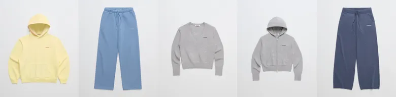 (写真左から) Classics Fleece Hoodie ¥31,900 / Classics Fleece Straight Sweatpant ¥29,700 / Classics V-Neck Sweater ¥49,500 / Classics Shrunken Sweater Full Zip Hoodie ¥49,500 / Classics Sweater Lounge Pant ¥38,500 (すべて税込)