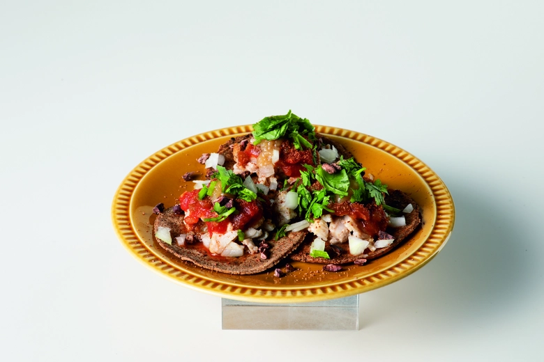 <RESTAURANT L’EAUVE(レストランローブ)>による「ムニュカカオ」では、ベンガルスパイスや鹿のコンソメといった意外性のある素材を用い、カカオの新たな表情を引き出す。