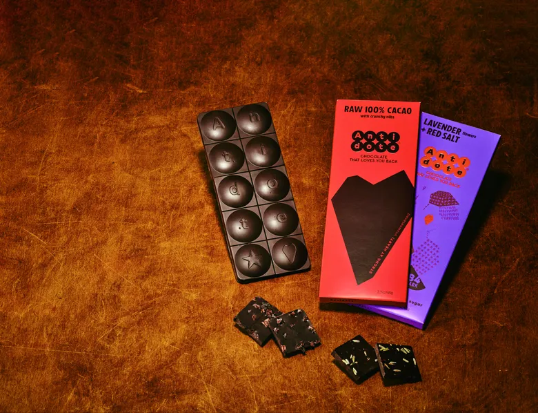 低温焙煎によるローカカオを用いる<ANTIDOTE(アンチドート)>は、添加物を極力使わず、カカオ本来の香りや力強さを引き出したタブレットを展開。ラベンダーやレッドソルトなど自然素材を掛け合わせたフレーバーは、シンプルでありながら印象に残る味わいを生む。