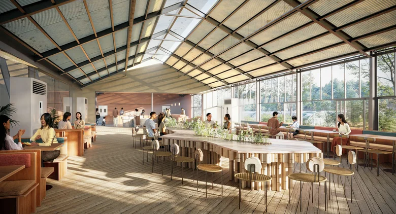 アジアの観葉植物を中心に構成された「ガーデンリビング(温室/内庭)」と、日本の四季を感じる「アウトドアリビング(外庭)」「公園と畑」の3エリアに分かれ、植物に囲まれて滞在できる空間を演出。ランドスケープは「YOEN」が手がけ、園内で育てた植物を飲食やプロダクトにも活用する。